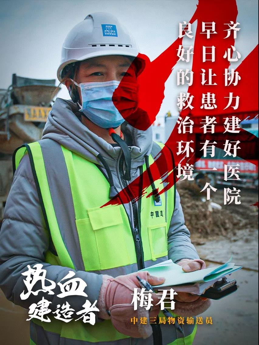 梅君,44岁,山东东营人,中建三局负责现场物资输送。她说,齐心协力建好医院早日让患者有一个良好的救治环境。