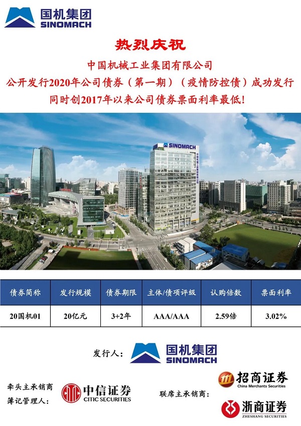 为进一步支持抗击疫情、保障企业发展,国机集团抓住有利市场时机,于2月28日在上海证券交易所市场成功簿记发行中国机械工业集团有限公司公开发行2020年公司债券(第一期)(疫情防控债),发行规模20亿元,部分募集资金将用于各类防疫生产投入,保障企业积极响应疫情防控工作,彰显国机集团作为“国家保障队”的央企担当。