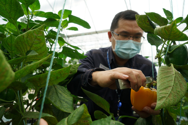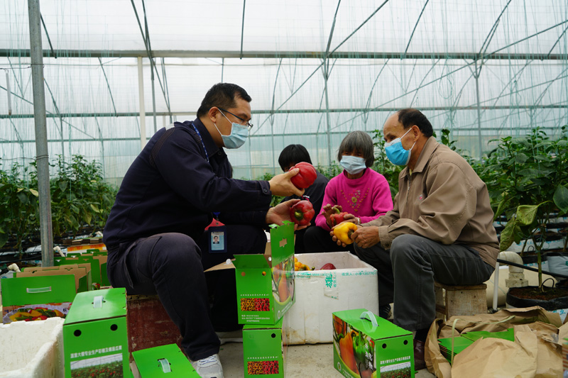 春天里,大棚里的彩椒苗比较潮湿,结出的果子质量不好,扶贫干部和村民一起,严把成品质量关。谭茂茜 摄
