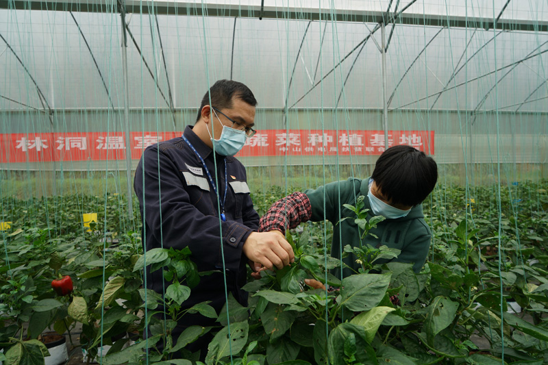疫情期间,南方电网广东中山供电局扶贫干部高锋,正在定点扶贫村肇庆市林洞村彩椒种植大棚内,和农户一起检查彩椒幼苗的生长情况。谭茂茜 摄