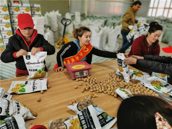 华电新疆公司采取“农户+合作社+企业”模式,通过设计定制包装、帮助装盒包装、联系物流公司等“一条龙”服务,帮助创建上阿图什品牌核桃,并协助做好产品分级、包装、分拣、检测等环节,让优质的土特产能够及时到达全国各地。该公司2019年累计销售核桃60500千克,带动300余户建档立卡贫困户足不出户在自家门口增收。