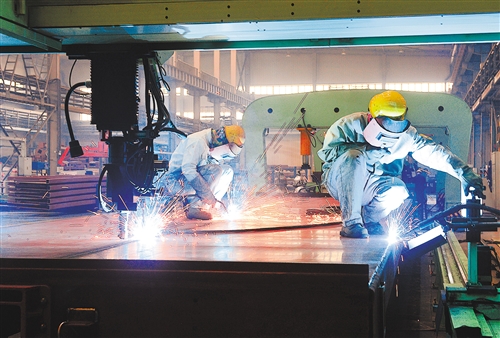 一机集团北方创业公司员工正在进行底架铺板焊接。