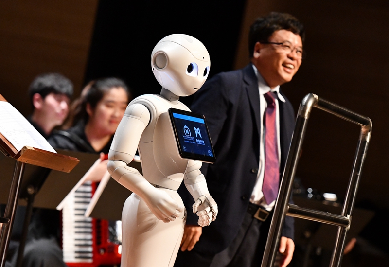 在天津大剧院,智能机器人指挥乐团演奏曲目(2019年6月16日摄)。