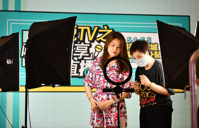 工作人员在天津市和平区大悦城利用手机直播进行线上销售(5月2日摄)。