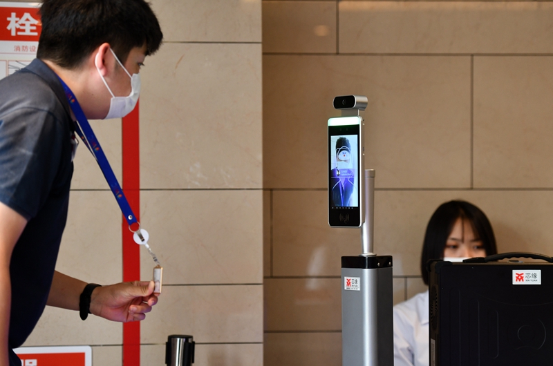 在天津梅地亚大剧院,相关人员进入第四届世界智能大会会场时戴着口罩也可以实现身份识别并测温(6月23日摄)。