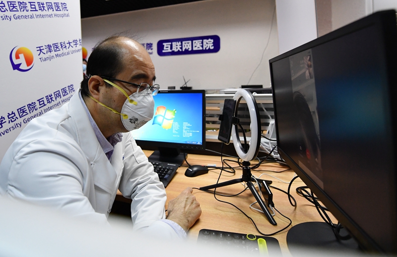 在天津医科大学总医院互联网医院,医生用手机视频进行线上问诊(3月3日摄)。