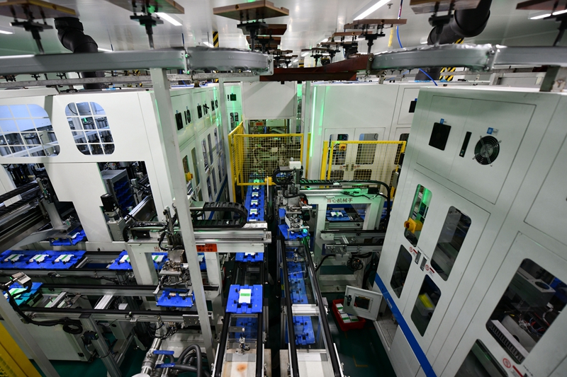 这是天津力神六期甲工厂生产车间内的一条自动化生产线(2019年12月9日摄)。