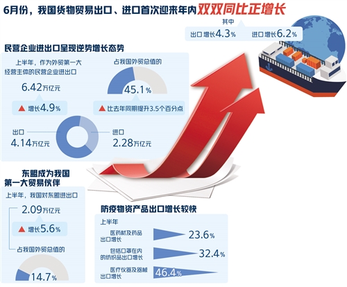 从月度走势看,6月份我国进出口同比增长5.1%。其中,出口自4月份起连续3个月保持同比正增长;进口也于6月份实现“转负为正”,增长6.2%。