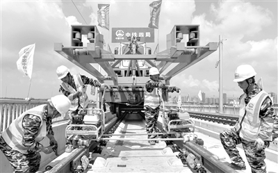 中铁四局施工人员正在进行高铁长轨铺设作业。
