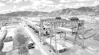 中铁四局承建的杭(州)绍(兴)台(州)铁路正在进行提梁架设作业。