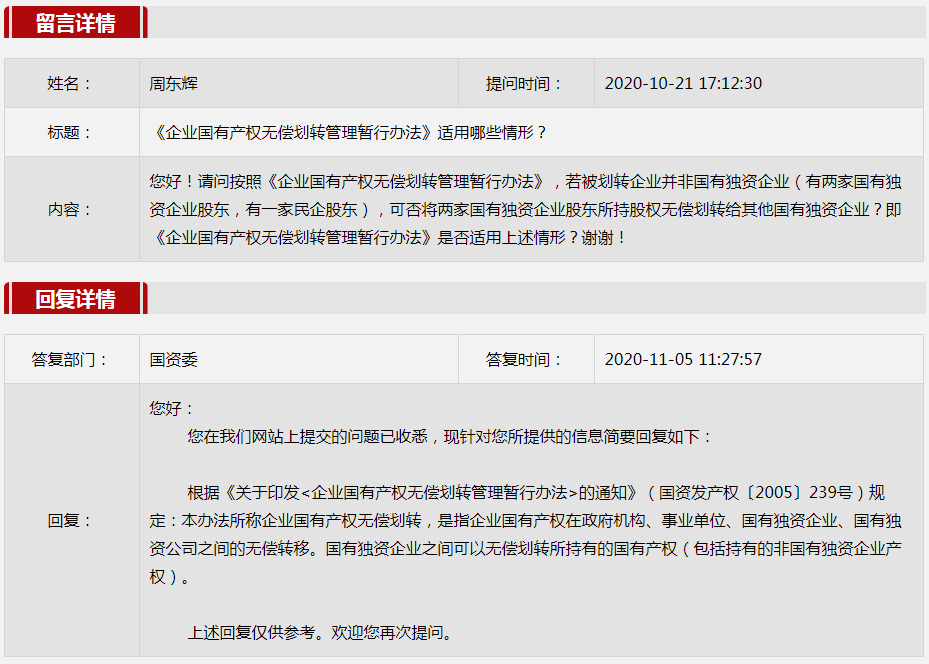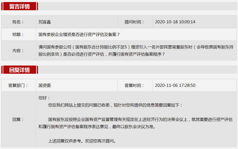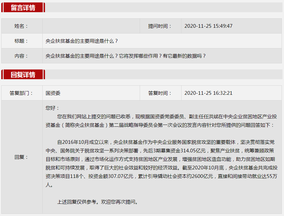 2020年11月国资委网站政务咨询栏目部分网友提出的咨询,我们初步做出了认真的回应,现选择五条关注度高、点击量高的问题,再次推荐分享。