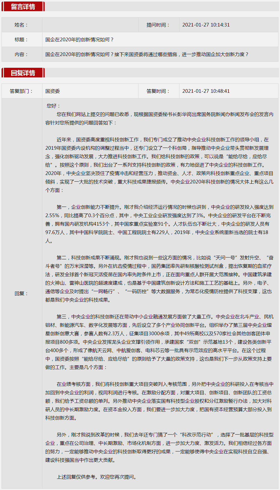 2021年1月国资委网站政务咨询栏目部分网友提出的咨询,我们初步做出了认真的回应,现选择五条关注度高、点击量高的问题,再次推荐分享。