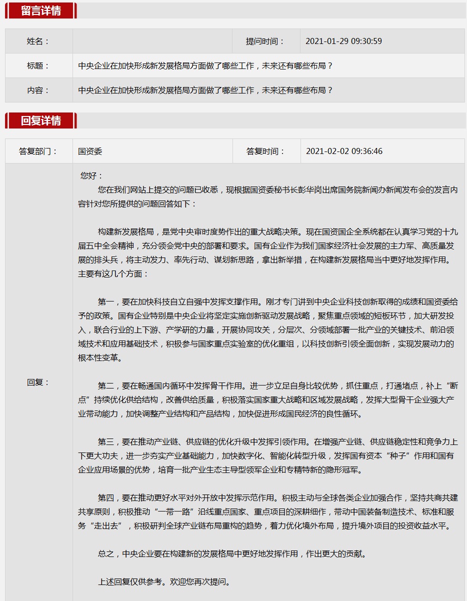 2021年2月国资委网站政务咨询栏目部分网友提出的咨询,我们初步做出了认真的回应,现选择五条关注度高、点击量高的问题,再次推荐分享。