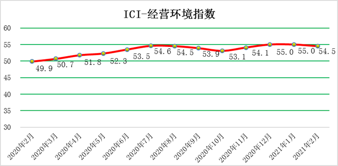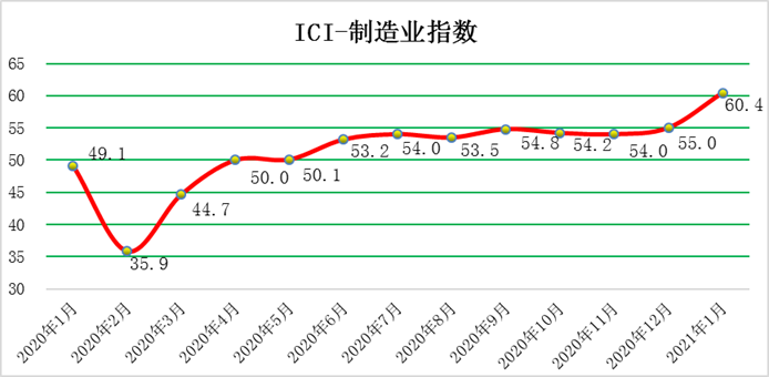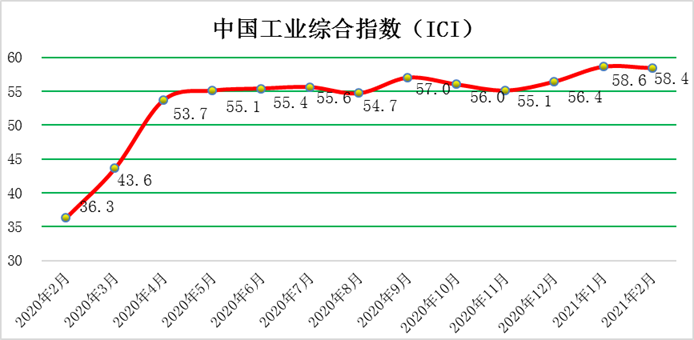 2021年2月份,中国工业综合指数(以下简称ICI)为58.4%,环比下降0.2个百分点,受春节效应影响小幅回落,自去年4月份以来连续位于荣枯线以上,表明中国工业经济总体持续恢复。生产状况指数为66.7%,环比上涨1.3个百分点,继续保持高位,企业生产活动积极平稳进行。效益状况指数为52.5%,环比下降0.5个百分点,小幅回落。经营环境指数为54.5 %,环比回落0.5个百分点,在保持较高位的基础上连续位于荣枯线之上,反映了市场经营环境持续改善。融资难易指数为47.2%,环比下降1.0个百分点,持续位于荣枯线下方,且该指数仍低于50%的均衡线,表明当前企业融资难融资贵的问题持续存在,针对此难题还需更有效的货币、财政政策等。预期发展指数为59.6 %,环比下降1.8个百分点,有所回落但持续位于荣枯线以上,该指数依旧长期保持高位优势。ICI制造业指数为60.1 %,环比回落0.3个百分点,但处于高位,自去年4月份以来连续位于荣枯线以上,表明制造业总体持续回暖。