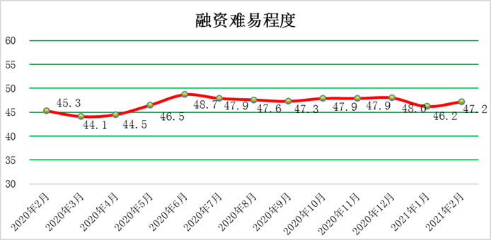 2月份,经营环境指数为54.5%,环比回落0.5个百分点,该指数近一年浮动不大,市场经营环境情况持续向好。具体来看,税费负担指数为52.3%,环比下降1.5个百分点,有所回落,连续3个月回落,税费政策还需深化,但继续位于荣枯线之上,企业目前税负情况持续改善;融资难易指数为47.2%,环比上涨1.0个百分点,企业融资环境长期以来并没有得到改善,说明当前企业融资仍需政府出台、调整相关政策以改善;市场秩序指数58.5%,环比回落1.9个百分点,持续高于荣枯线且处高位,市场秩序持续改善。