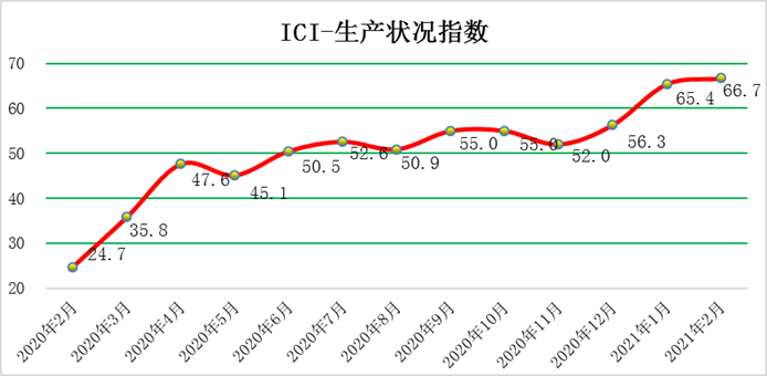 2月份,生产状况指数为66.7 %,环比上涨1.3个百分点,小幅上涨,连续处于高位,总体看,工业生产情况良好,生产活动持续恢复。具体来看:产量指数为67.9%,环比上涨1.1个百分点,生产活动持续活跃;销量指数为69.5%,环比上涨0.7个百分点,继续位于荣枯线之上,新订单指数上涨,国内需求持续增加,销量增速稳定。出厂价格指数为57.4%,环比上涨1.4个百分点,工业品总产值上涨,与此相应,企业出厂价格指数上涨。主营业务收入指数为66.8%,环比上涨0.6个百分点,企业出厂价格和销量同时上涨,企业的主营业务同比收入相对上升;设备利用率指数为62.9%,环比上涨0.9个百分点,企业产能持续恢复,出货持续顺畅。