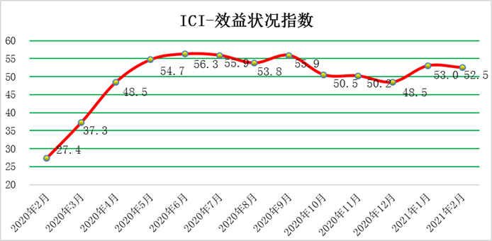 2月份,效益状况指数为52.5 %,环比回落0.5个百分点,继续位于荣枯线之上,效益状况持续恢复。具体来看,利润指数为59.9%,环比上涨1.1个百分点,企业盈利情况持续向好;成本指数为29.7%,环比下降2.4个百分点,企业在成本方面的负担不断加重,值得关注;产成品库存指数为55.7%,环比下降3.5个百分点,继续位于荣枯线之上,需求大于生产,产品库存减少。净资产回报率指数为57.4%,环比下降1.3个百分点,继续位于荣枯线之上,企业净资产持续得到改善。