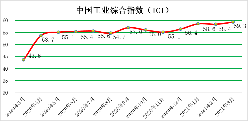 2021年3月份,中国工业综合指数(以下简称ICI)为59.3%,环比上涨0.9个百分点,春节效应影响消除,增速短期加快,同时自去年4月份以来连续位于荣枯线以上,表明中国工业经济总体持续恢复。生产状况指数为66.3%,环比下降0.4个百分点,稍有回落但继续保持高位,企业生产活动积极平稳进行。效益状况指数为52.6%,环比上涨0.1个百分点,小幅回升。经营环境指数为53.9 %,环比回落0.6个百分点,连续位于荣枯线之上,反映了市场经营环境持续改善。融资难易指数为48.8%,环比上涨1.6个百分点,持续位于荣枯线下方,且该指数仍低于50%的均衡线,表明当前企业融资难融资贵的问题持续存在,针对此难题还需更有效的货币、财政政策等。预期发展指数为62.4 %,环比上涨2.8个百分点,大幅上涨且该指数依旧长期保持高位优势。ICI制造业指数为61.4%,环比上涨1.3个百分点,继续处于高位,自去年4月份以来连续位于荣枯线以上,表明制造业总体持续回暖。