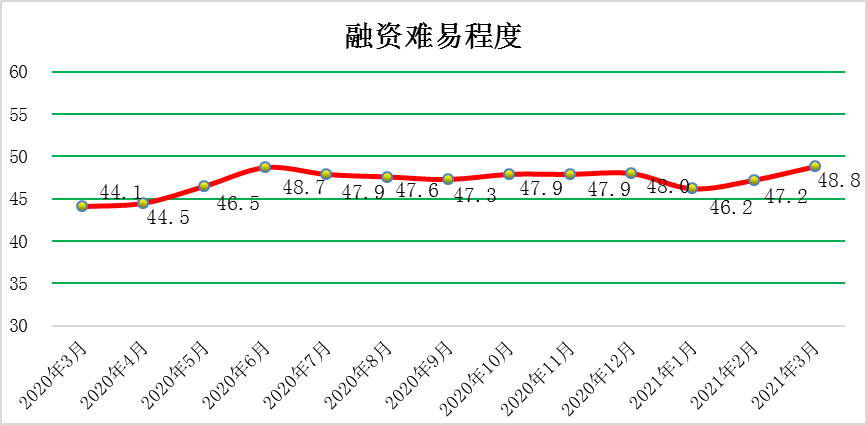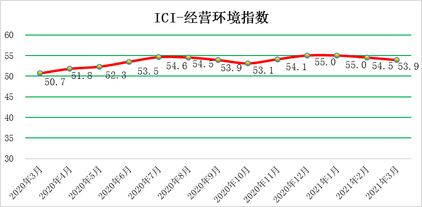 3月份,经营环境指数为53.9%,环比回落0.6个百分点,该指数近一年浮动不大,市场经营环境情况持续向好。具体来看,税费负担指数为47.9%,环比下降4.4个百分点,有所回落,连续4个月回落,且跌落于荣枯线以下,税费政策还需深化,企业目前税负情况并不乐观;融资难易指数为48.8%,环比上涨1.6个百分点,企业融资环境长期以来处于荣枯线下方,说明当前企业融资仍需政府出台、调整相关政策以改善;市场秩序指数62.8%,环比上涨4.3个百分点,持续高于荣枯线且处高位,市场秩序持续改善。