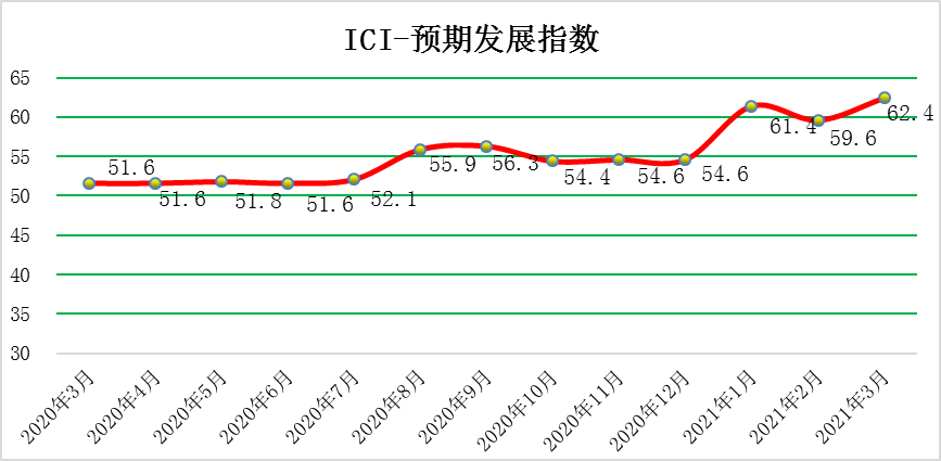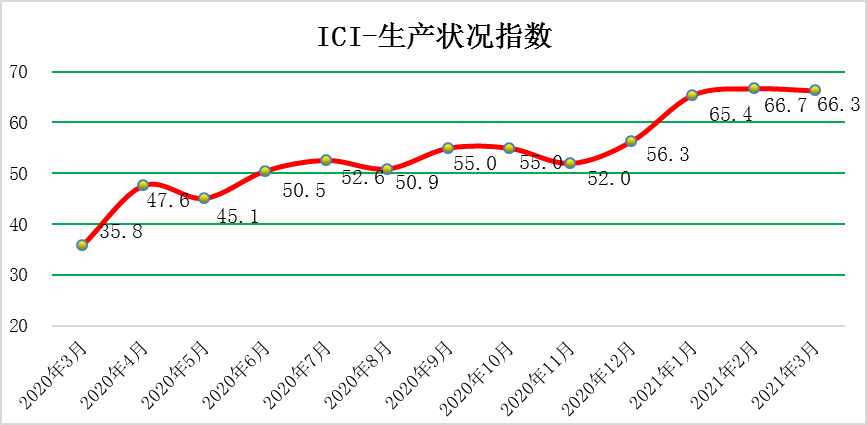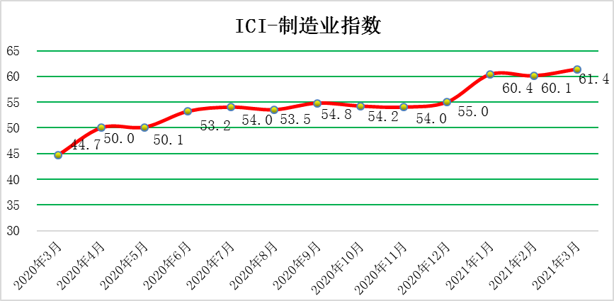 3月份ICI制造业指数为61.4%,环比上涨1.3个百分点,持续高于荣枯线。3月份,中国制造业采购经理指数(PMI)为51.9%,高于上月1.3个百分点,制造业景气回升。