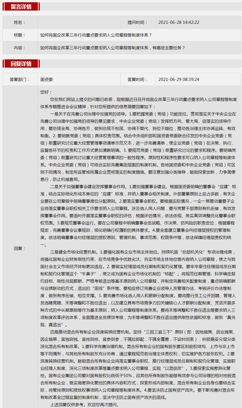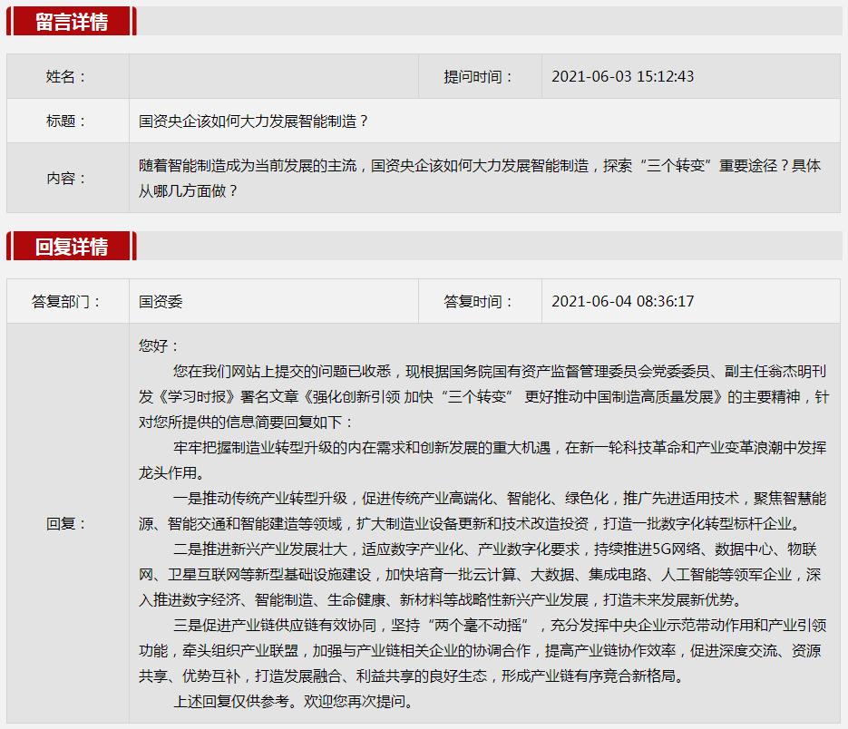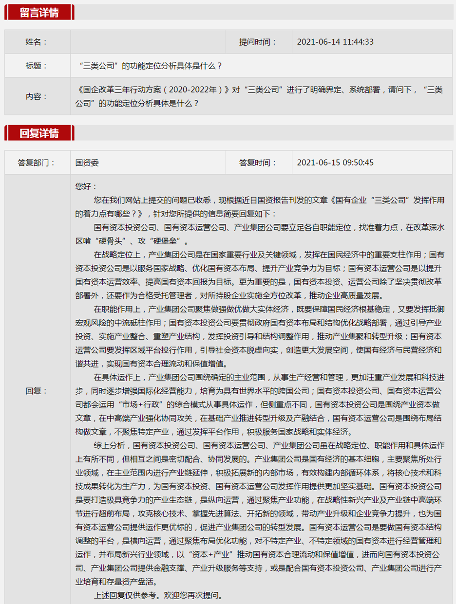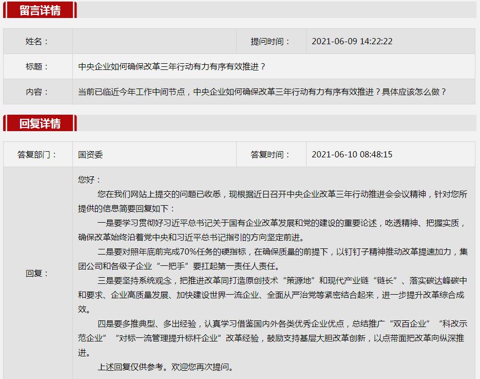 2021年6月国资委网站政务咨询栏目部分网友提出的咨询,我们初步做出了认真的回应,现选择五条关注度高、点击量高的问题,再次推荐分享。