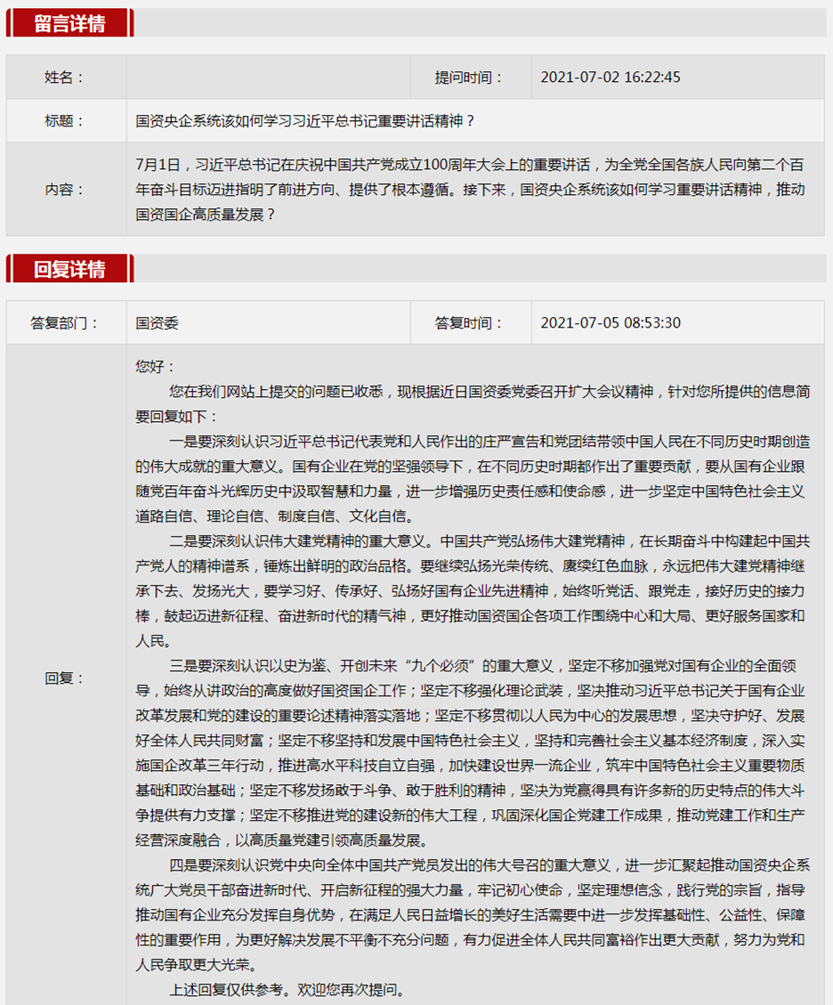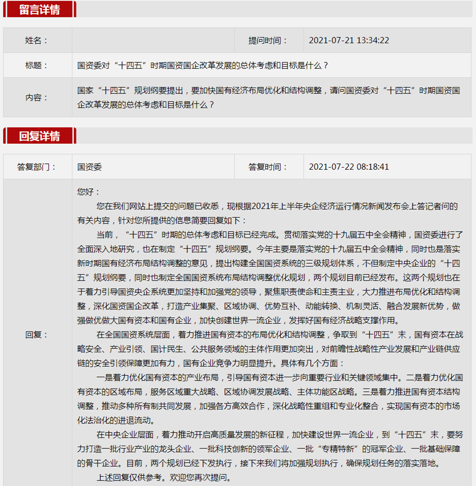 2021年7月国资委网站政务咨询栏目部分网友提出的咨询,我们初步做出了认真的回应,现选择五条关注度高、点击量高的问题,再次推荐分享。