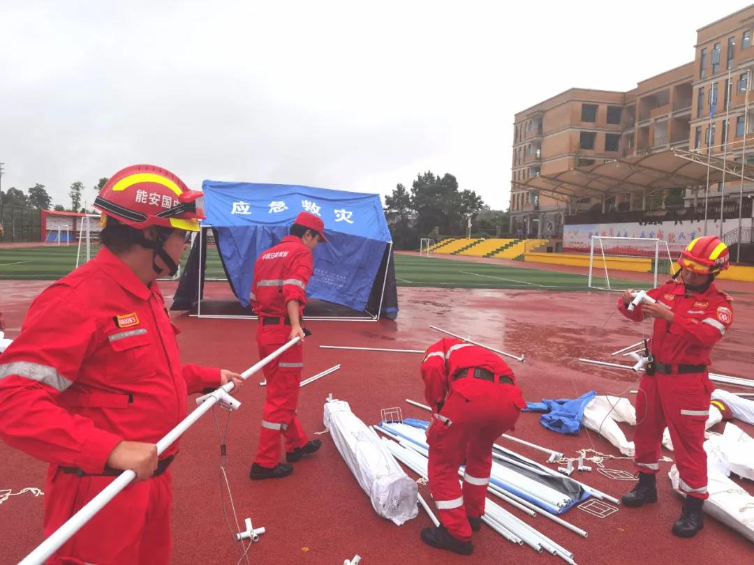 上午,现场大雨不断,全体救援队员冒雨在泸县城北小学设置受灾群众临时安置点,共搭设帐篷20顶,安置80人,搬运物资70件,大家齐心协力,顺利完成任务。下午转移至城东小学设置受灾群众临时安置点,并搬运救灾物资。