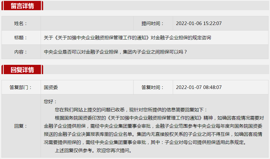 4.关于《关于加强中央企业融资担保管理工作的通知》对金融子企业担保的规定咨询。
