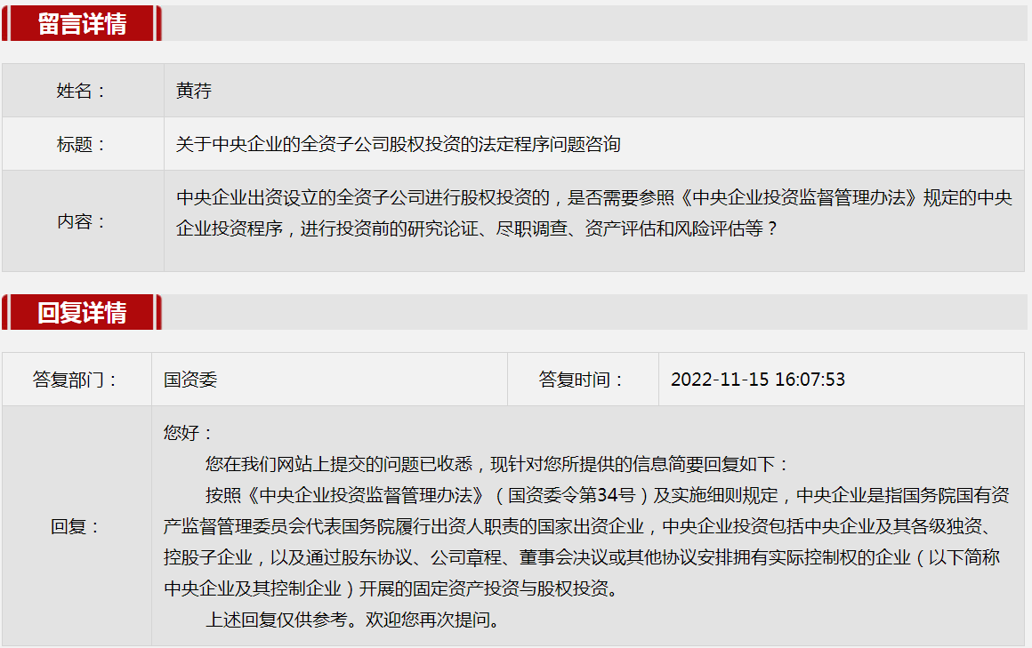 4.关于中央企业的全资子公司股权投资的法定程序问题咨询。