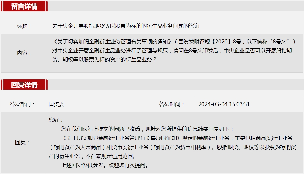1.关于央企开展股指期货等以股票为标的的衍生品业务问题的咨询