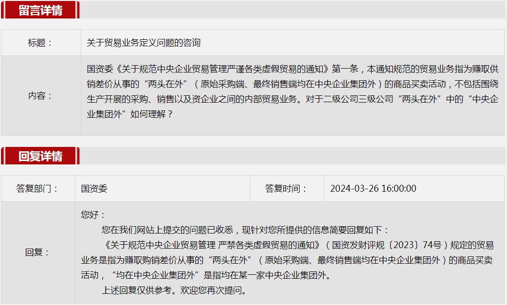 2024年3月国资委网站政务咨询栏目部分网友提出的咨询,我们初步做出了认真的回应,现选择五条关注度高、点击量高的问题,再次推荐分享。