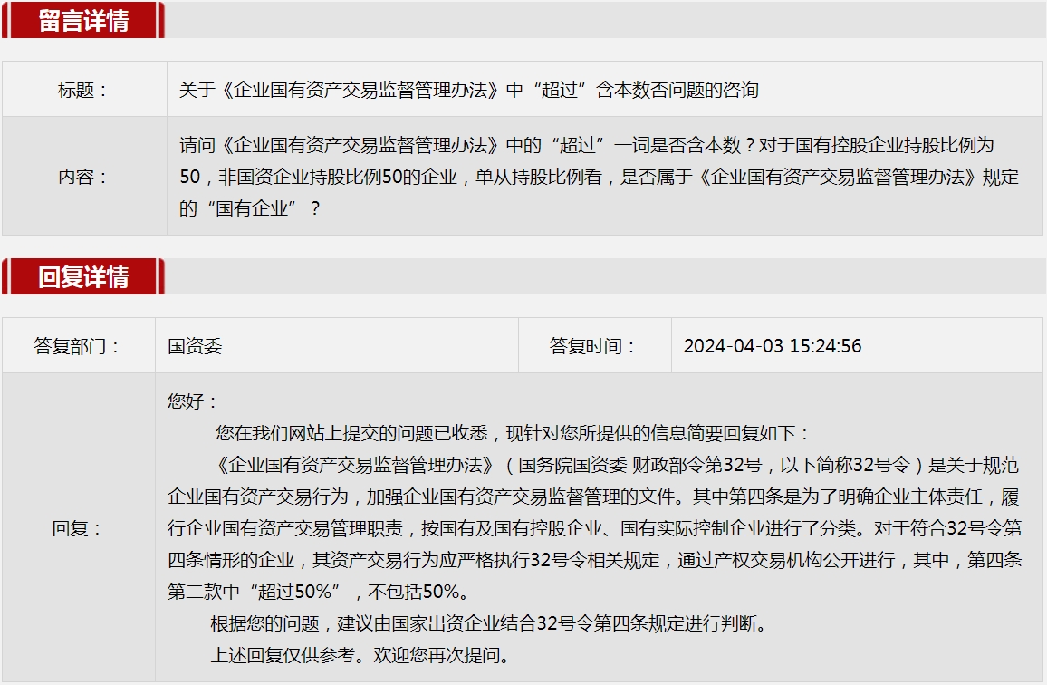 1.关于《企业国有资产交易监督管理办法》中“超过”含本数否问题的咨询