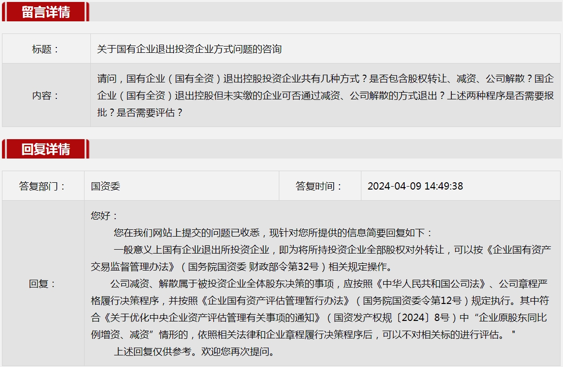 2024年4月国资委网站政务咨询栏目部分网友提出的咨询,我们初步做出了认真的回应,现选择五条关注度高、点击量高的问题,再次推荐分享。