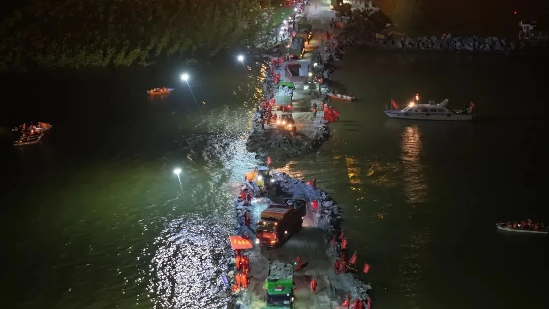“为了加快进度,从6日晚上起,我们增加水上抛投作业,采用大型驳船运输大块石,并在船上布置皮带输送机、驳船底开口进行抛投石料,平堵戗堤。”中国安能技术专家张轩庄说。整个夜晚,工程车辆的大灯、运输物料的卡车尾灯、大功率应急照明灯点亮了长长的大堤。