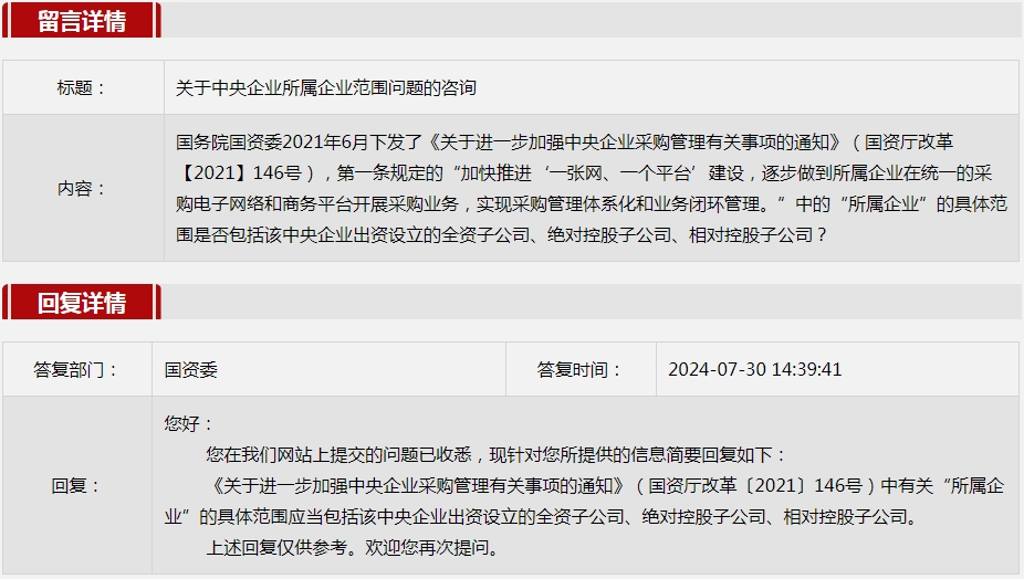 2024年7月国资委网站政务咨询栏目部分网友提出的咨询,我们初步做出了认真的回应,现选择五条关注度高、点击量高的问题,再次推荐分享。