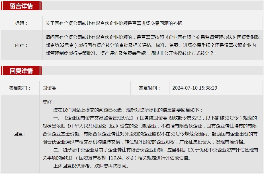 2.关于国有全资公司转让有限合伙企业份额是否需进场交易问题的咨询