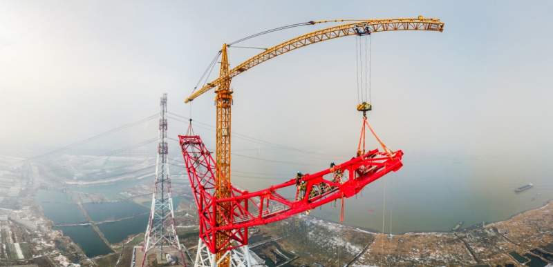 在安徽省繁昌县荻港镇,跨越塔在进行横担就位施工(无人机航拍,拼接照片)