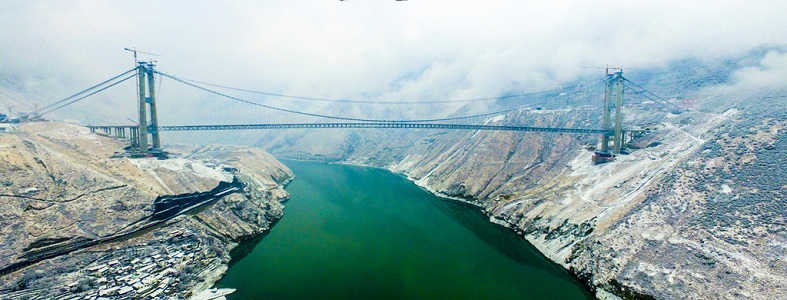 2月6日,由四川公路桥梁建设集团有限公司承建的雅康高速公路泸定兴康特大桥随着最后一段钢桁梁被吊装到位,桥身主体结构顺利实现合拢。该桥位于泸定大渡河峡谷,位于高海拔、地震高烈度地区,施工条件艰难,峡谷风场紊乱,全长1411米,主跨1100米,采用钢混叠合桥道系,总造价超过10亿元,被誉为“川藏第一桥”,预计2018年8月底实现贯通。