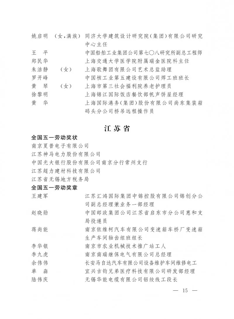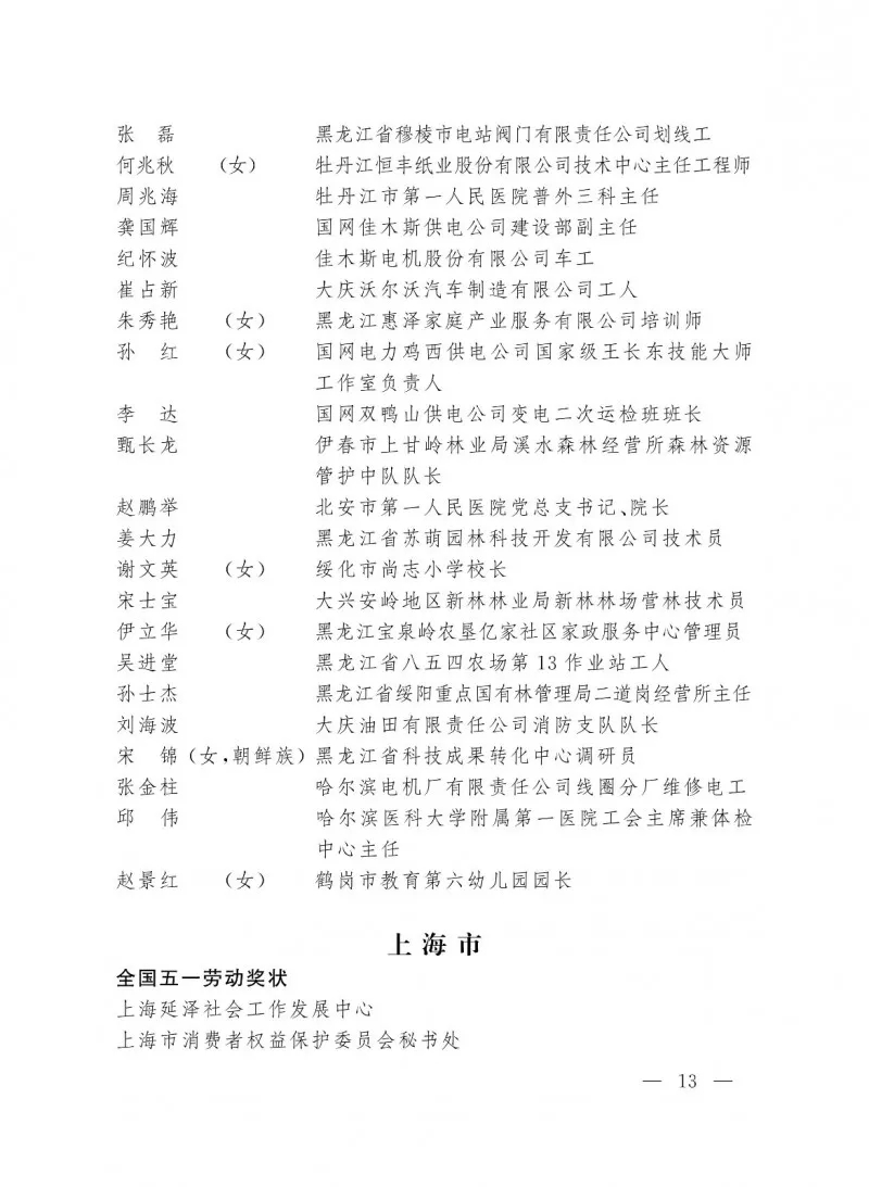 全国五一劳动奖和全国工人先锋号的评选工作坚持面向基层、面向一线、面向普通劳动者。据介绍,在奖章先进个人中,产业工人所占比例高出规定比例6.61个百分点。其他一线职工和专业技术人员有160名,占22.96%;科教人员151名,占21.66%;农民工89名,占12.77%。在全国工人先锋号集体中,有班组623个,占77.97%。这些群体所占比例均高出规定比例。与此同时,企业负责人仅为5.60%,比分配名额少6名;机关和事业单位县处级干部占2.44%,有14个省(区、市)没有推荐县处级干部。