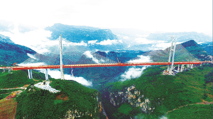 北盘江第一桥位于云南省和贵州省交界处,跨越北盘江大峡谷,是杭瑞(杭州至瑞丽)高速毕节至都格段的重点控制性工程。大桥全长1341.4米,主桥为跨径720米的钢桁梁斜拉桥,在同类型桥梁中位居世界第二。该桥桥面至谷底高差达565米,相当于200层楼高,是目前世界第一高桥。二航局负责大桥贵州岸施工,项目于2012年开工建设,2016年12月29日建成通车。大桥通车后,云贵两省又新增一条高速通道,从云南宣威到贵州六盘水车程由过去5小时缩短至1小时。