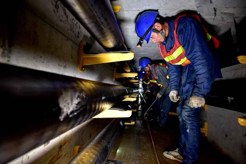 南方电网广东珠海供电局工作人员在220千伏加珠线线路工程隧道内敷设电缆