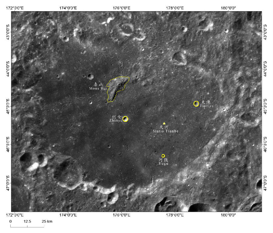 2019年2月15日,中国国家航天局、中国科学院和国际天文学联合会联合召开新闻发布会,向全世界发布嫦娥四号着陆区域月球地理实体命名。2019年2月4日,国际天文学联合会(IAU)批准了利用探月工程嫦娥二号和嫦娥四号高分辨月面影像数据申报的嫦娥四号着陆点及其附近5个月球地理实体命名:嫦娥四号着陆点命名为天河基地;着陆点周围呈三角形排列的三个环形坑,分别命名为织女、河鼓和天津;着陆点所在冯·卡门坑内的中央峰命名为泰山。这是我国月球探测工程科学数据成果在月球地理实体命名上的又一次重要应用。