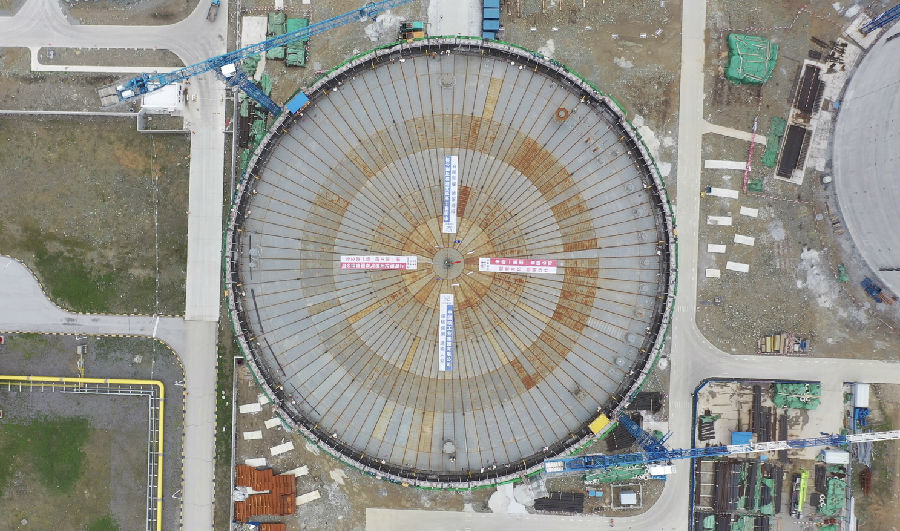 如此大的动作是如何做到的?据项目承建方中核五公司相关人士介绍,储罐安装气升顶技术是利用穹顶结构与储罐外壁之间形成密闭空间的特点,使用多台鼓风机向密闭空间不断地输送低压空气,从而罐顶钢结构按照预定路径上升至设计高度,并与罐顶承压环连接。