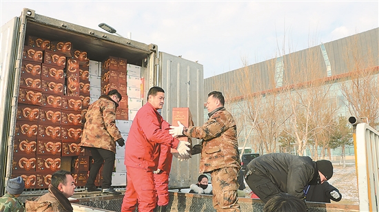 图为新疆油田员工从物流车上卸运和搬送采购于托里县的农副特色产品。 张革新 摄