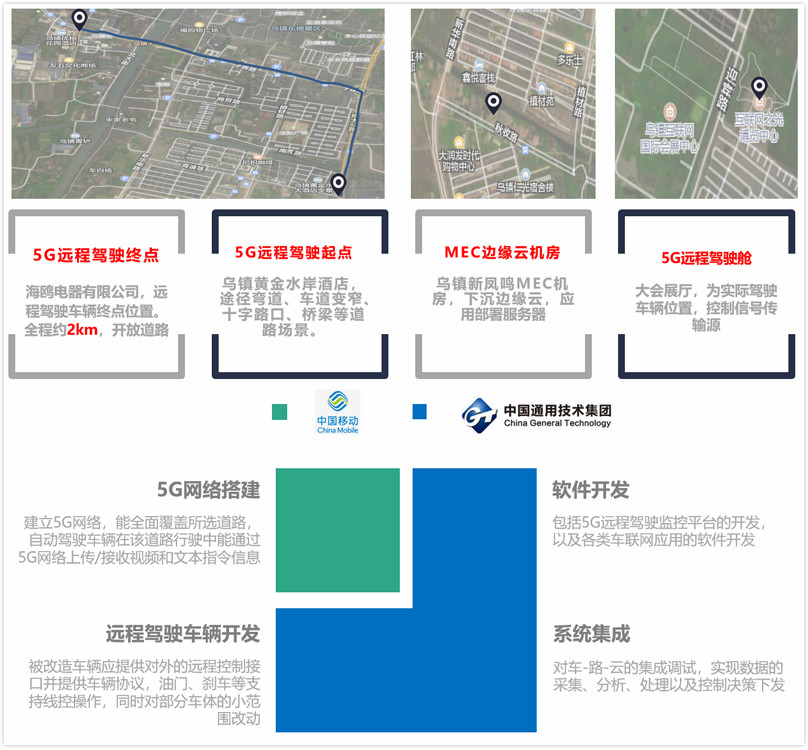 该5G车辆网运营基地是由中国通用技术集团中国汽车工程研究院股份有限公司结合自身自动驾驶技术研发优势,打造的第三个自动驾驶示范基地。据中国通用技术集团中国汽车工程研究院副总经理周舟介绍,基地搭建通过23天快速完成了解决方案设计、5G+MEC网络调通、远程驾驶车辆开发、软件开发、系统集成等,实现车辆的远程操作、5G远程车辆状态信息实时获取、“车-路-云”集成系统高速的数据采集、分析、处理及控制决策。项目以乌镇途径弯道、车道变窄、十字路口、桥梁等道路为场景依托,通过中国移动边缘计算(MEC)系统支持,全程覆盖5G SA网络,智能化改造近4km的真实公开道路,实现自动驾驶车辆在行驶中通过5G网络上传/接收视频和控制指令。