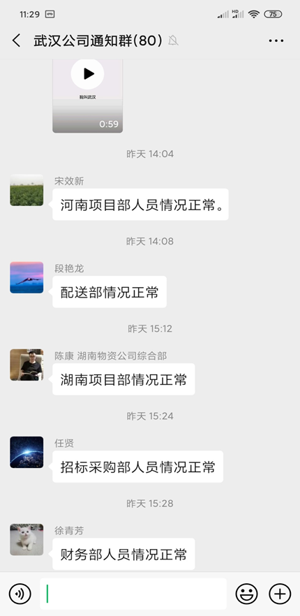 中国水利电力物资武汉公司成立了应对疫情工作领导小组和办公室,层层落实责任,并于每天下午通过微信视频形式开会讨论当天防控工作情况,全面落实疫情防控工作。从1月22日开始,该公司严格控制上下班人员数量,实行除特殊岗位和值班要求外,职工在家隔离办公措施;积极联系附近的医疗卫生部门,购买防护口罩、酒精和84消毒液,对办公区域进行了全面的消毒处理,做好外来人员登记;重点关注新冠肺炎密切接触者以及从武汉离开去往外地职工情况,随时掌握离退休人员身体情况和位置,协调做好防疫措施;加强节日电话值班,确保信息畅通,应急事项有效处理;并通过企业微信工作群,组织大家学习、了解最新政策情况,加强对职工的宣传和引导,确保职工队伍稳定。