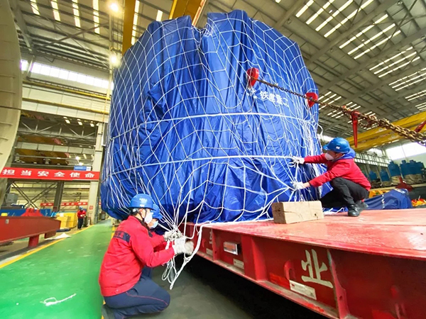 早在春节前,该设备就已经完成了工厂验收和部分拆机工作。由于工程项目急需,从2月6日开始,车间班组在做好防疫保护的前提下,部分工人提前展开设备打包、装箱、防护、发运工作,并在设备发运前,详细地对设备进行了全机消毒处理。