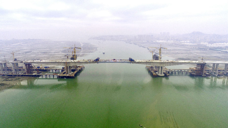 泉厦漳城市联盟路泉州段起于晋江市永和镇,终于南安市石井镇与厦门海翔大道相接,路线全长约27公里,采用高速公路双向六车道标准建设,设计时速100公里,计划今年建成通车。其中,泉厦漳城市联盟路跨海大桥是全线的控制性工程,大桥主桥设计为混合梁连续刚构桥,全长570米,主跨300米,为国内在建同类型桥梁跨径第一。