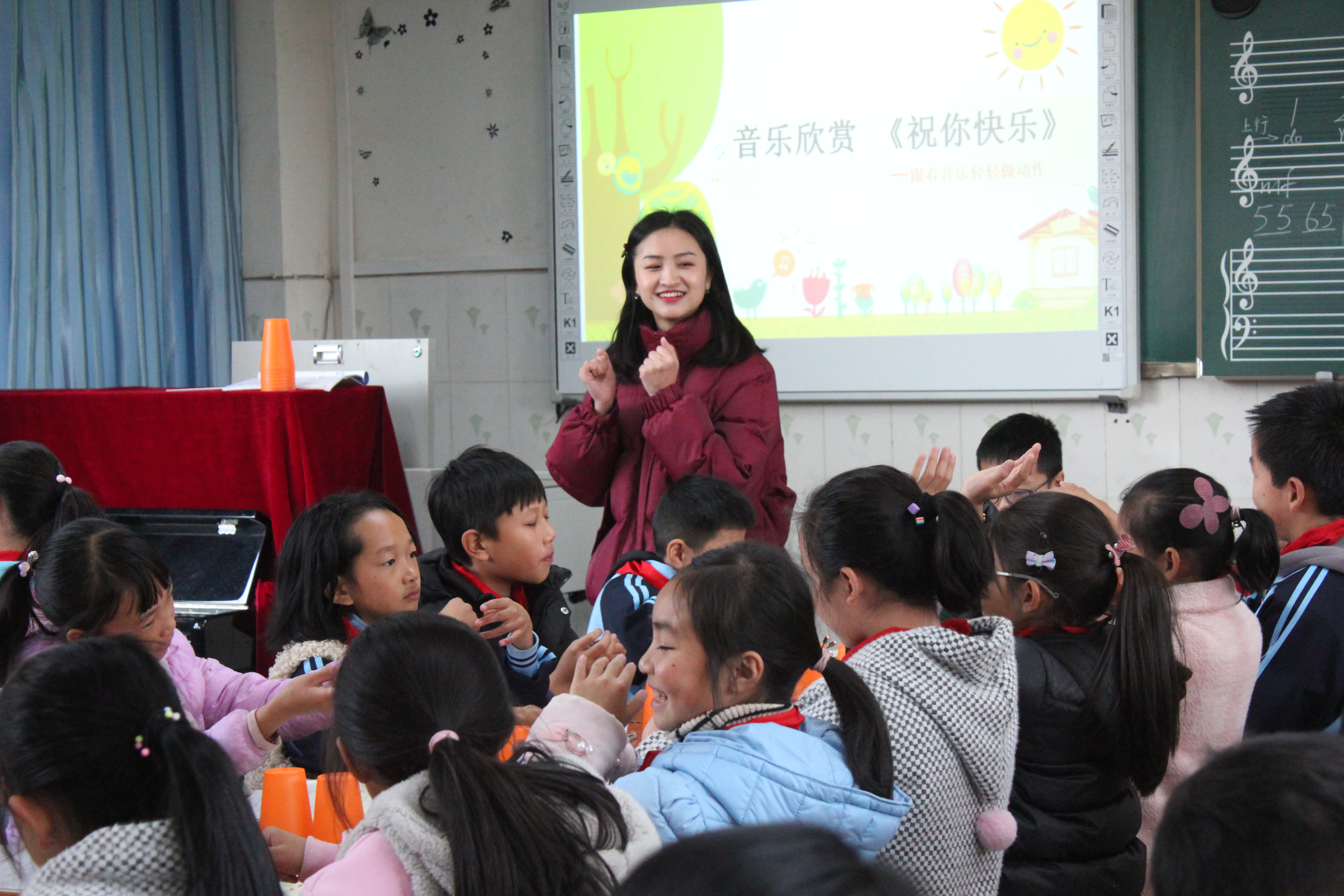 彭薇老师和孩子们在一起打造的音乐教室里唱快乐歌。照片由凉山州西昌市西乡乡中心小学提供。