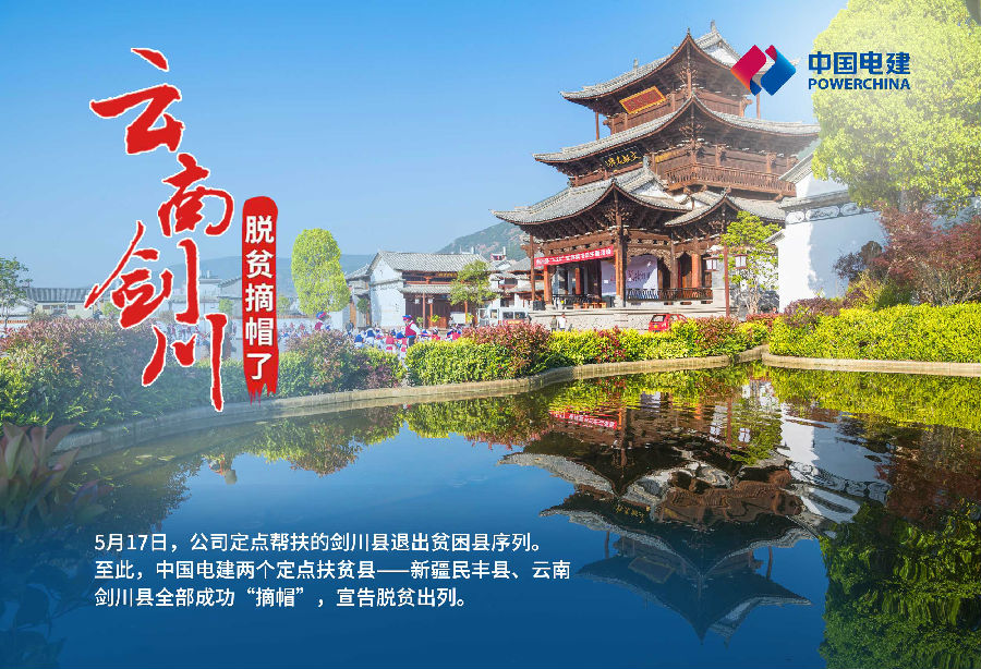 近日,经云南省人民政府批准,中国电建定点帮扶的剑川县退出贫困县序列,正式脱贫摘帽。至此,中国电建两个定点扶贫县——新疆民丰县、云南剑川县全部成功“摘帽”,宣告脱贫出列。